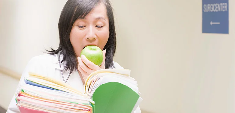 In this episode Marie meets Beth Frates, MD. Trained as a physiatrist, Beth coaches people to adopt healthy lifestyles, with an emphasis on diet, sleep, stress resiliency and exercise. In this MedPEP episode, Beth focuses on nutrition and healthy eating patterns as critical factors to energize Marie over the course of rigorous days in the clinic. She describes the evidence-based Harvard Healthy Plate - half is comprised of vegetables and fruits, one quarter is whole grains, and the last quarter includes healthy proteins. Beth sings the praises of the health-promoting vitamins, minerals and antioxidants contained in vegetables, as well as the energy-sustaining fiber found in whole grains such as brown rice and quinoa. She underscores the importance of consuming healthy sources of protein such as beans, seeds, nuts, fish and unprocessed, lean meat, all of which sustain energy more effectively than simple carbo-hydrates. Beth engages with Marie in a collaborative and empowering way, enhancing her motivation to make health-promoting changes in her diet, despite her harried work schedule. Beth also introduces the idea of mindful and restful eating, and by the end of the podcast, Marie finds herself close to taking on the challenge of setting aside 15-20 minutes of clinic time to take a restorative lunch break. Marie continues to struggle with putting her own basic needs ahead of the daily demands of her medical practice.